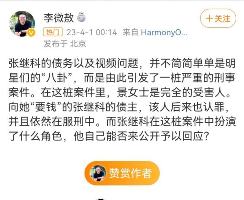 不知道大家对张继科的事情有什么看法呢?欢迎在评论区表达你的观点。甜!张继科公开与景甜恋情 晒海边牵手照.网易 景甜宣布与张继科分手:感恩曾相遇 愿今后安好.新浪网张继科方面回应赌债传闻:无任何债务纠纷,已委托律师起诉.封面新闻 安踏:已终止和张继科所有合作.百家号(南方新闻网).2023-04-03 “张继科事件”再发酵 疑似另一张“欠条”浮出水面?.极目新闻